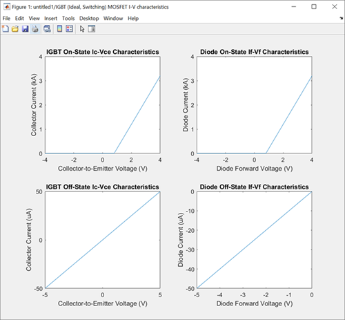 The plots you generate with the Basic characteristics option depend on the values you specify for the Modeling option, On-state behavior and losses, and Integral protection diode parameters of the block.