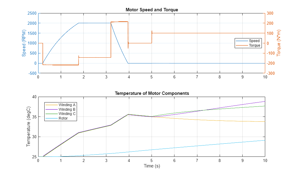 The plot below shows motor speed, torque, and temperature of motor components. The thermal model of the motor models heat transfer between the three windings and the rotor.