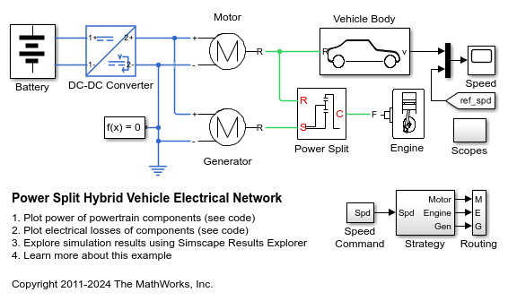 The motor, generator, and DC-DC converter are modeled using Simscape™ Electrical™ library blocks. These blocks use energy-based system-level equations that result in an efficient simulation whilst still capturing conversion losses. As such, the model is suitable for supporting design of the power management strategy. This example can be directly compared with the Simscape Driveline™ sdl_hybrid_power_split example which also includes more accurate representations of the engine, tires and mechanical gears.