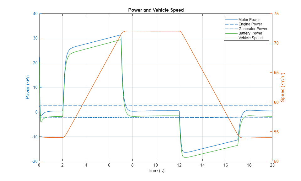 The plot below shows the flow of power from the engine, motor, and generator as the vehicle accelerates and decelerates. The generator supplies the DC network with a constant flow of power drawn from the engine. The motor draws power from the battery to accelerate the vehicle and then uses regenerative braking to feed that power back to the battery.