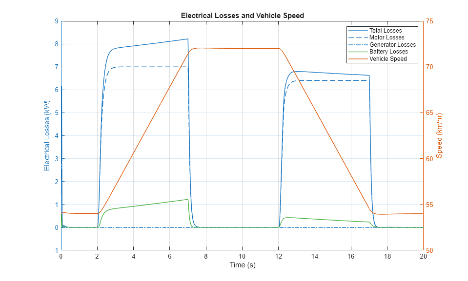 The plot below shows the electrical losses from the motor, generator, and battery as the vehicle accelerates and decelerates. The largest losses come from the motor and the battery.