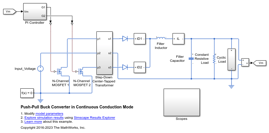 This example shows how to control the output voltage of a push-pull buck converter. The current flowing through the inductor is never zero. The DC-DC converter therefore operates in continuous conduction mode (CCM). To convert and maintain the nominal output voltage, the PI Controller subsystem uses a simple integral control. During startup, the reference voltage ramps up to the desired output voltage.