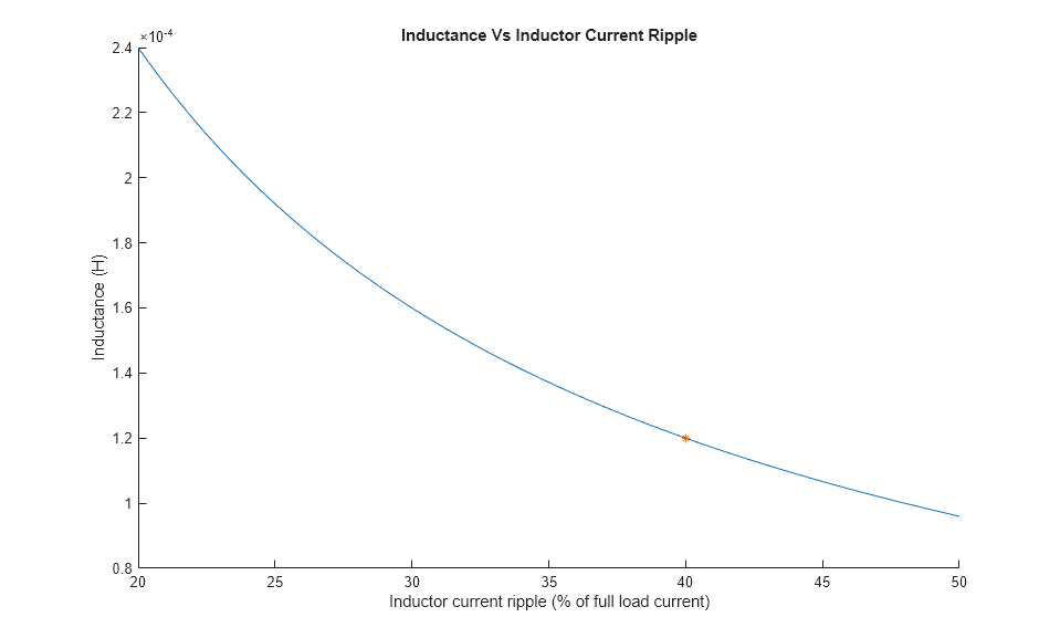 Generate this plot to see how the filter inductance relates to the inductor ripple current (expressed as a percentage of full load current). For this example, the marker at 40% corresponds to an inductance of 1.2e-04 H.