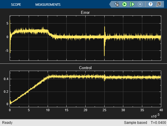 To view the control and error data during or after the simulation, open the PI Controller Scope block from the model window or enter open_system('PushPullBuckCCM/Scopes/PI Controller Scope');.
