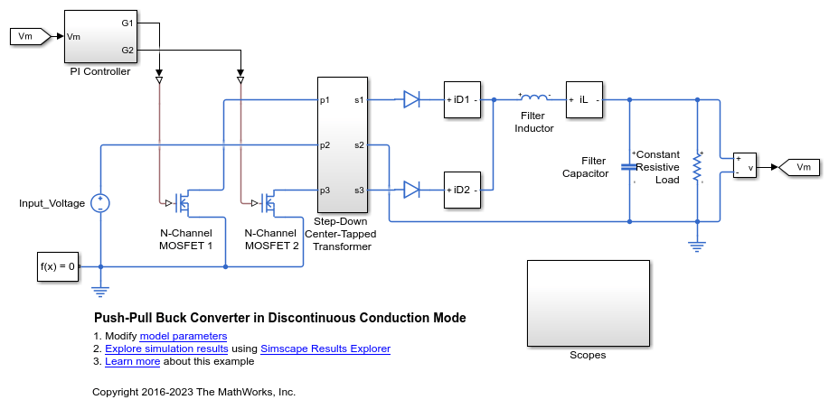 This example shows how to control the output voltage of a push-pull buck converter. The current flowing through the inductor reaches zero during the switch off cycle of the MOSFETs and therefore the DC-DC converter operates in Discontinuous Conduction Mode (DCM). This mode of conduction is mostly used for low-power applications. To convert and maintain the input DC voltage as a nominal output voltage, the PI Controller subsystem uses a simple integral control. During startup, the reference voltage is ramped up to the desired output voltage.