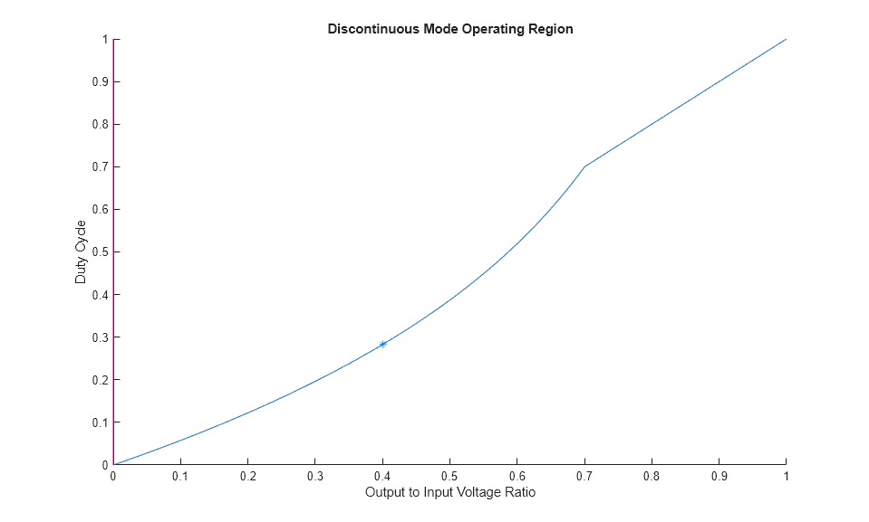 The operating modes can be visualised for different values of K by generating a plot between the Output Voltage Ratio and the Duty Cycle. From this plot, find the corresponding Duty Cycle needed to achieve the Output Voltage Ratio as specified in the Design Parameters for the particular value of K chosen.