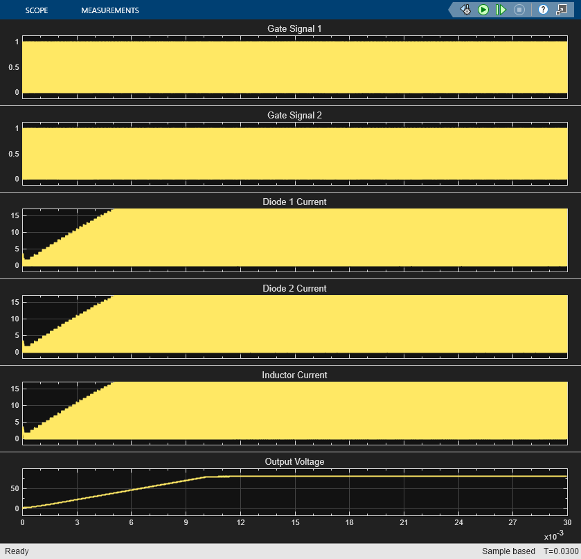 To view summary results during or after the simulation, open the Circuit Scope block from the Scopes subsystem or by entering, at the MATLAB command prompt: