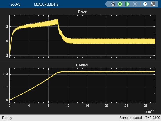 To view the control and error data during or after the simulation, open the PI Controller Scope block from the Scopes subsystem or, enter: