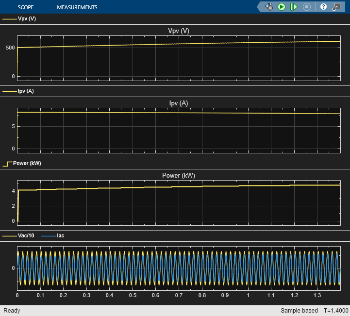 To open a script that provides information on the parameterization, features, and options in this example, at the MATLAB® Command Window, enter: edit 'SinglePhaseGridSolarPVData'