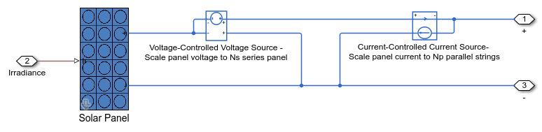 The solar plant subsystem models a solar plant that contains parallel-connected strings of solar panels. The solar panel is modeled using the Solar Cell block from the Simscape™ Electrical™ library. This example estimates the number of series-connected solar panels in a string based on the supply voltage, voltage drop across the line inductor, supply voltage fluctuation, and open-circuit voltage dependence on temperature and irradiance. This example estimates the number of parallel-connected solar panel strings based on the plant power rating. Connecting multiple panels slows down the simulation because it increases the number of elements in a model. By assuming uniform irradiance and temperature across all the solar panels, the Solar Panel subsystem reduces the number of solar elements by using the controlled current and voltage sources.