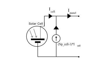 Connecting multiple solar cell strings in parallel slows down the simulation because it increases the number of elements in a model. To avoid a reduction in performance, a controlled-current source scales up the current to the fulfill the demand of the requisite number of parallel paths. The current source is modeled by a Current-Controlled Current Source block from the Simscape™ Foundation Library.