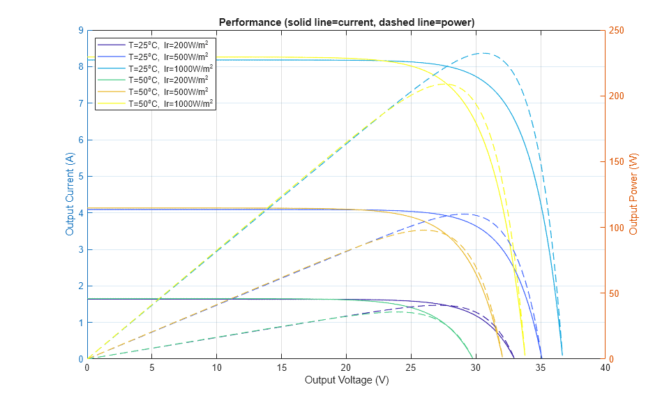 This plot shows the current and power as a function of voltage for various irradiance and cell temperatures. The table shows the peak power values extracted from the plot. If the datasheet includes a similar plot, then you can use it to validate the correct parameterization of the Solar Cell block.