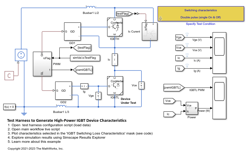 This example provides test harness for estimating switching loss for different parameters of a N-Channel IGBT block.