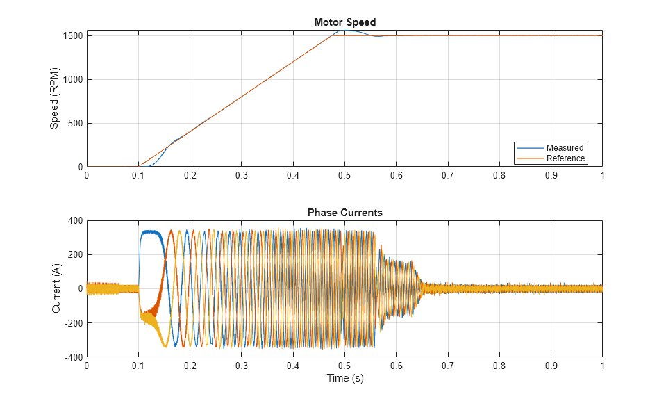 The plot below shows the requested and measured speed for the test, as well as the phase currents in the electric drive.