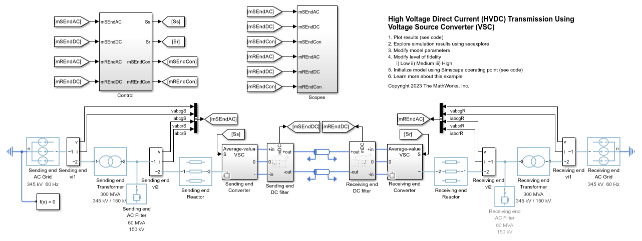 This example models a high-voltage, direct-current (HVDC) transmission system using voltage source converters (VSCs).