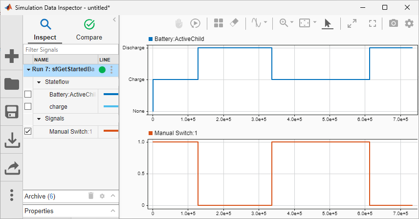 Battery:ActiveChild.To display the output of the Manual Switch block, click the bottom graph. Then, in the Inspect tab, expand the Signals section and select