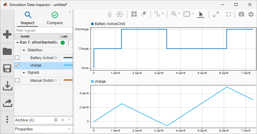 .To display the active state of the chart, click the top graph. Then, in the Inspect tab, expand the Stateflow section and select