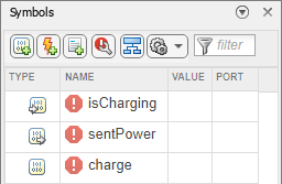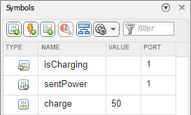 2. Set the initial charge of the battery. In the Symbols pane, in the charge row, click the Value column and enter 50.