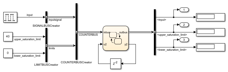 In this example, a Stateflow chart receives a bus input signal from Simulink by using the input inbus and outputs a bus signal from outbus. The input signal comes from the Simulink Bus Creator block COUNTERBUSCreator, which bundles signals from two other Bus Creator blocks. The output outbus connects to a Simulink Bus Selector block. Both inbus and outbus derive their type from the Simulink.Bus object COUNTERBUS. For more information about this example, see Integrate Custom Structures in Stateflow Charts.