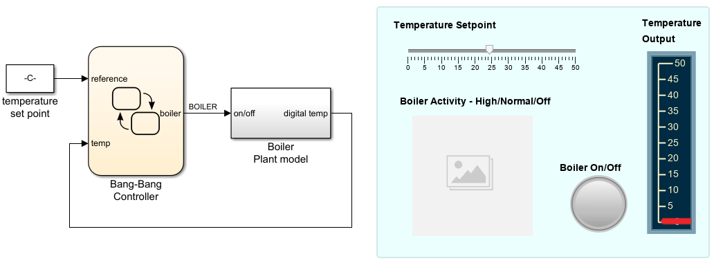 This example shows how to use dashboard blocks to control the temperature setpoint for a boiler and visualize when the boiler is on or off and what mode it is operating in.