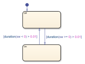 The initial state for this model is Off. By using the duration operator, you can control which state is active based on how long the switch signal, sw, has been negative or nonnegative.