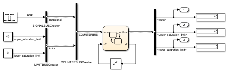 In this example, a Stateflow chart processes data from one Simulink bus and outputs the result to another Simulink bus. Both the input and output buses are defined by the object Simulink.Bus (Simulink)COUNTERBUS. In the chart, the Simulink buses interface with the Stateflow structures inbus and outbus. The chart calls a custom C function to write to the output structure outbus.