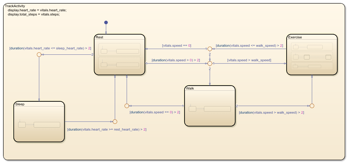 The chart Fitness Tracker models the core logic of the fitness tracker. The chart consists of four subcharts that correspond to the possible activities. The chart registers your activity status based on the heart rate and speed produced by the Human Simulator chart and transitions between these subcharts. To filter out signal noise, the chart uses the duration operator to implement simple debouncing logic. For instance, when you are at rest, you can make some quick and sudden movements that do not correspond to exercise. The chart determines that you are walking or exercising only if your motion lasts longer than two minutes (or two seconds of simulation time). The chart monitors the active child state and passes this information to the App Interface chart through the output data status. For more information, see Monitor State Activity Through Active State Data.