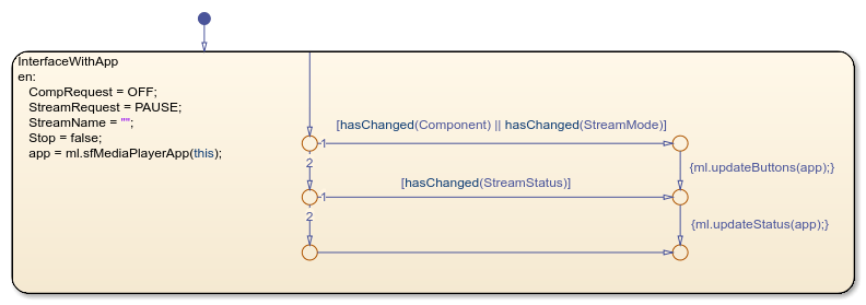 Conversely, in the chart, the entry actions in the InterfaceWithApp state run the app sfMediaPlayerApp and store the returned value as the local data object app. The chart uses this local data object when it calls the helper functions updateStatus and updateButtons. In the app, these helper functions update the media player status message and enable, disable, or change the color of the playback buttons based on the value of the chart inputs Component, StreamMode, and StreamStatus.