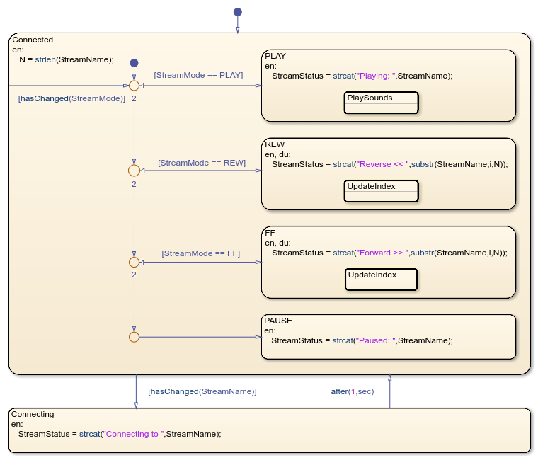 StreamModeequalsPLAY, the entry action in the statePLAYsets the status message to the string"Playing:"followed by the value ofStreamName.When the value of