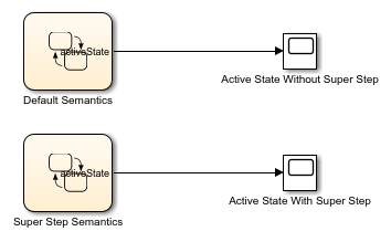 This example shows how super step semantics differs from default semantics. The model contains two Stateflow charts. One chart uses super step semantics. In the other, super step semantics are disabled.
