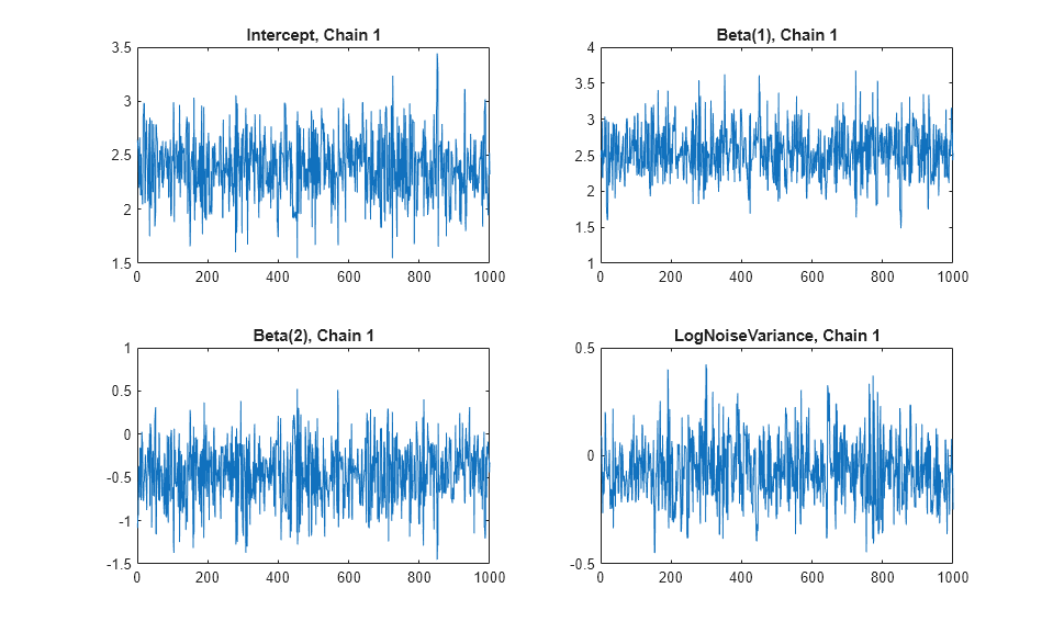 Investigate issues such as convergence and mixing to determine whether the drawn samples represent a reasonable set of random realizations from the target distribution. To examine the output, plot the trace plots of the samples using the first chain.