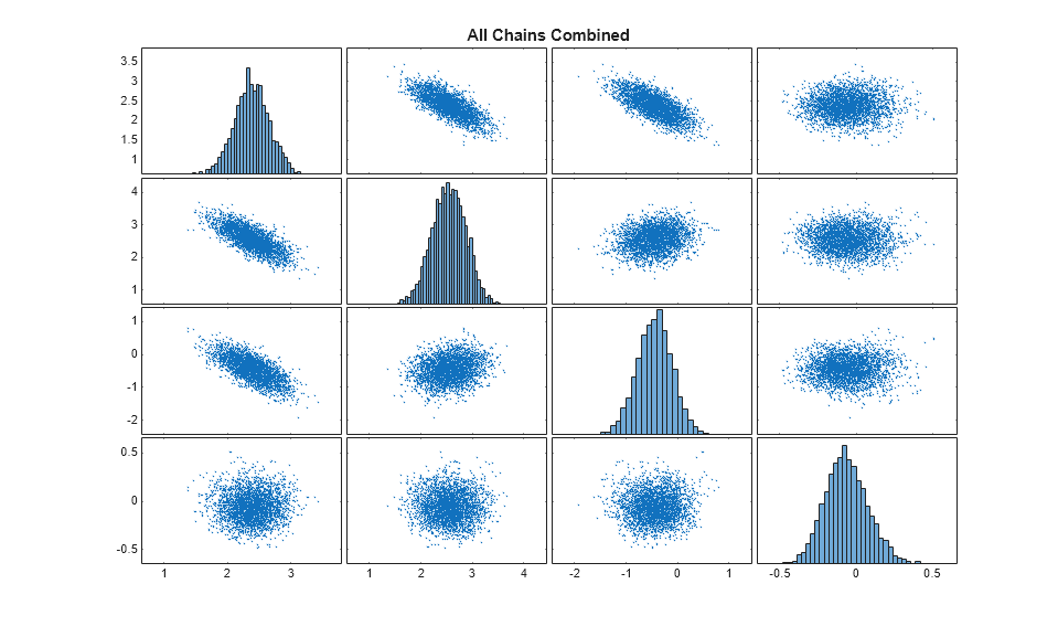 Combine the chains into one matrix and create scatter plots and histograms to visualize the 1-D and 2-D marginal posterior distributions.