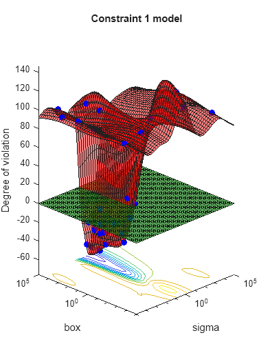 results = bayesopt(fun,[sigma,box],'IsObjectiveDeterministic',true,... 'NumCoupledConstraints',1,'PlotFcn',... {@plotMinObjective,@plotConstraintModels},... 'AcquisitionFunctionName','expected-improvement-plus','Verbose',0);