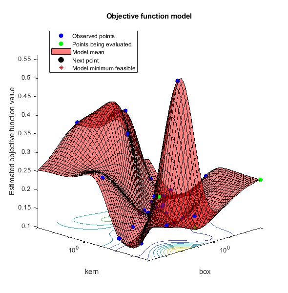 |===============================================================================================================| | Iter | Active | Eval | Objective | Objective | BestSoFar | BestSoFar | box | kern | | | workers | result | | runtime | (observed) | (estim.) | | | |===============================================================================================================| | 1 | 2 | Accept | 0.2735 | 0.56171 | 0.13105 | 0.13108 | 0.0002608 | 0.2227 | | 2 | 2 | Accept | 0.35897 | 0.4062 | 0.13105 | 0.13108 | 3.6999 | 344.01 | | 3 | 2 | Accept | 0.13675 | 0.42727 | 0.13105 | 0.13108 | 0.33594 | 0.39276 | | 4 | 2 | Accept | 0.35897 | 0.4453 | 0.13105 | 0.13108 | 0.014127 | 449.58 | | 5 | 2 | Best | 0.13105 | 0.45503 | 0.13105 | 0.13108 | 0.29713 | 1.0859 |