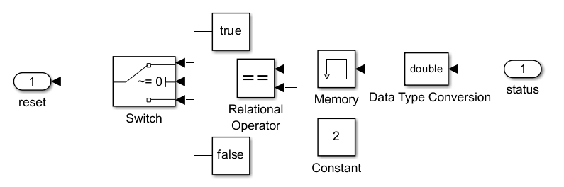 The Detect Drift block resets the drift detector when the status is 2, which means drift is detected by the Reset Logic subsystem. The sample reset logic provided with the example accepts the status signal as input. This signal is converted to a double, and the memory block delays the signal by one time-step. The Relational Operator block equates the status signal to 2. If the status is 2, the Switch block outputs a true signal (1). You can modify the reset logic to suit the needs of your application.