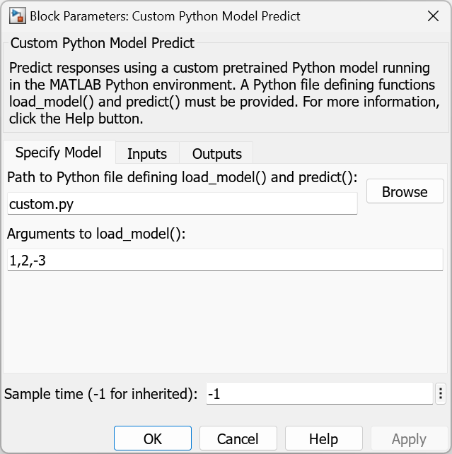Double-click the Custom Python Model Predict block to open the Block Parameters dialog box. Enter custom.py in the Path to Python file defining load_model() and predict() text box.