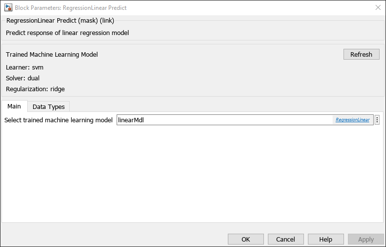 Double-click the RegressionLinear Predict block to open the Block Parameters dialog box. Specify the name of the workspace variable that contains the trained linear model. The default variable name is linearMdl. Click the Refresh button. The dialog box displays the options used to train the linear model linearMdl under Trained Machine Learning Model.