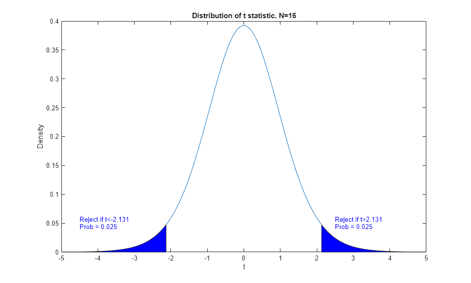 N = 16; df = N-1; alpha = 0.05; conf = 1-alpha; cutoff1 = tinv(alpha/2,df); cutoff2 = tinv(1-alpha/2,df); x = [linspace(-5,cutoff1), linspace(cutoff1,cutoff2),linspace(cutoff2,5)]; y = tpdf(x,df); h1 = plot(x,y); xlo = [x(x<=cutoff1),cutoff1]; ylo = [y(x<=cutoff1),0]; xhi = [cutoff2,x(x>=cutoff2)]; yhi = [0, y(x>=cutoff2)]; patch(xlo,ylo,'b'); patch(xhi,yhi,'b'); title('Distribution of t statistic, N=16'); xlabel('t'); ylabel('Density'); text(2.5,.05,sprintf('Reject if t>%.4g\nProb = 0.025',cutoff2),'Color','b'); text(-4.5,.05,sprintf('Reject if t<%.4g\nProb = 0.025',cutoff1),'Color','b');