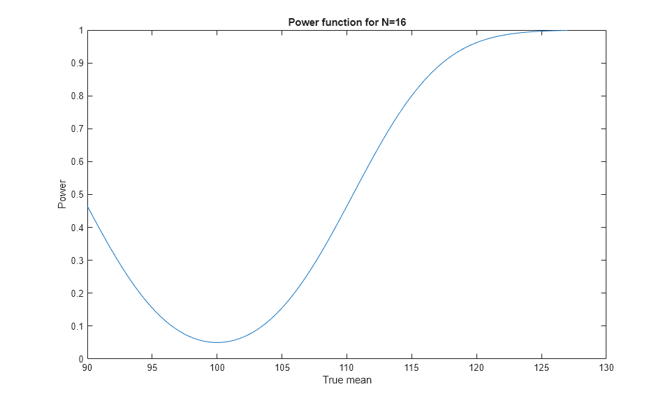 N = 16; x = linspace(90,127); power = sampsizepwr('t',[100 20],x,[],N); plot(x,power); xlabel('True mean') ylabel('Power') title('Power function for N=16')