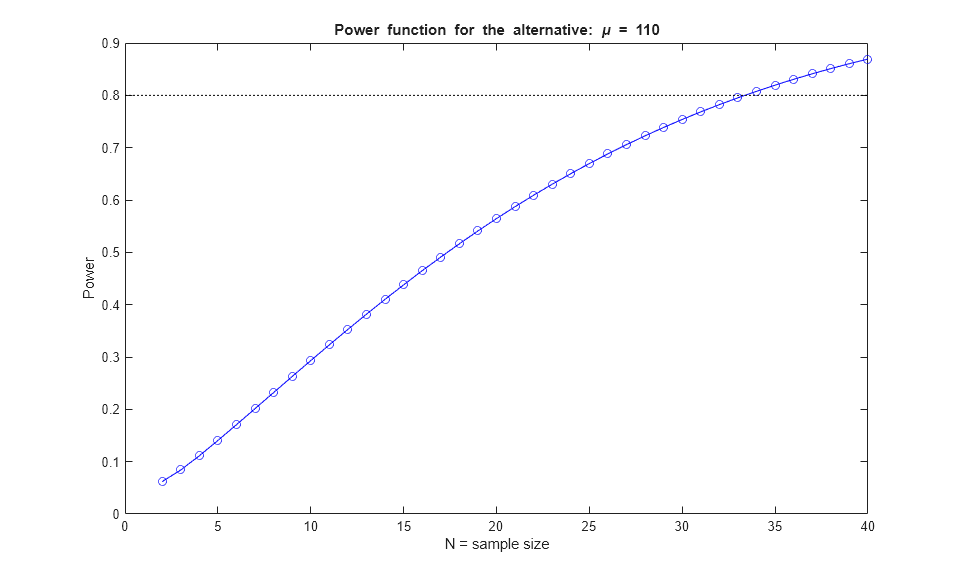 Nvec = 2:40; power = sampsizepwr('t',[100 20],110,[],Nvec); plot(Nvec,power,'bo-',[0 40],[DesiredPower DesiredPower],'k:'); xlabel('N = sample size') ylabel('Power') title('Power function for the alternative: \mu = 110')