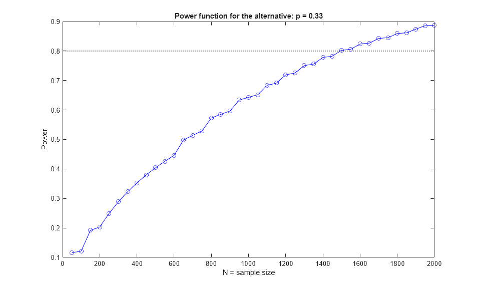Nvec = 50:50:2000; power = sampsizepwr('p',p0,p1,[],Nvec,'tail','right'); plot(Nvec,power,'bo-',[0 2000],[DesiredPower DesiredPower],'k:'); xlabel('N = sample size') ylabel('Power') title('Power function for the alternative: p = 0.33')