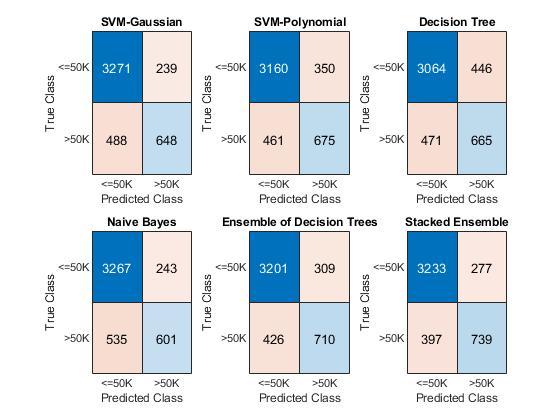 figure c = cell(N+1,1); for i = 1:numel(c) subplot(2,3,i) c{i} = confusionchart(adulttest.salary,label(:,i)); title(names{i}) end