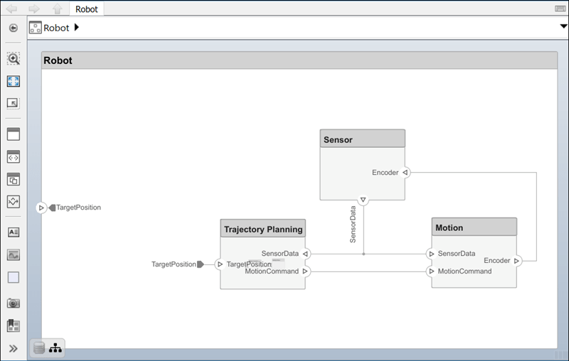 Open the architecture model of a robot arm that consists of sensors, motion actuators, and a planning algorithm. You can use System Composer to view the interfaces and manage the requirements for this model.