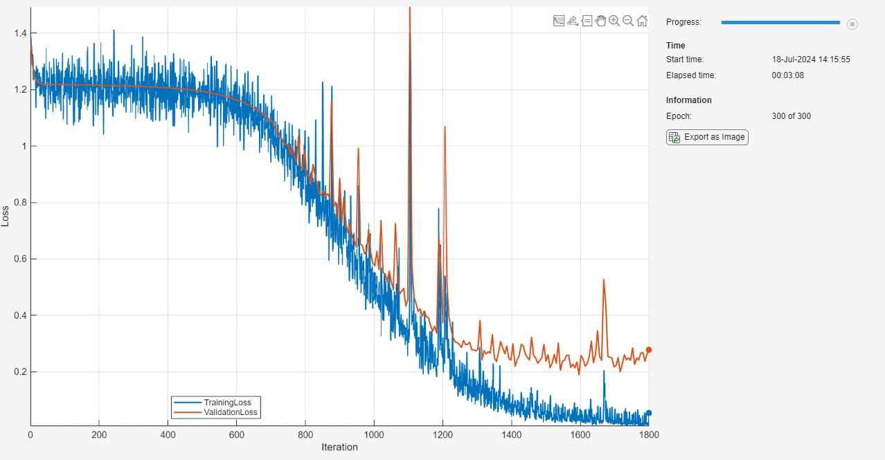 monitor = trainingProgressMonitor( ... Metrics=["TrainingLoss","ValidationLoss"], ... Info="Epoch", ... XLabel="Iteration"); groupSubPlot(monitor,"Loss",["TrainingLoss" "ValidationLoss"])