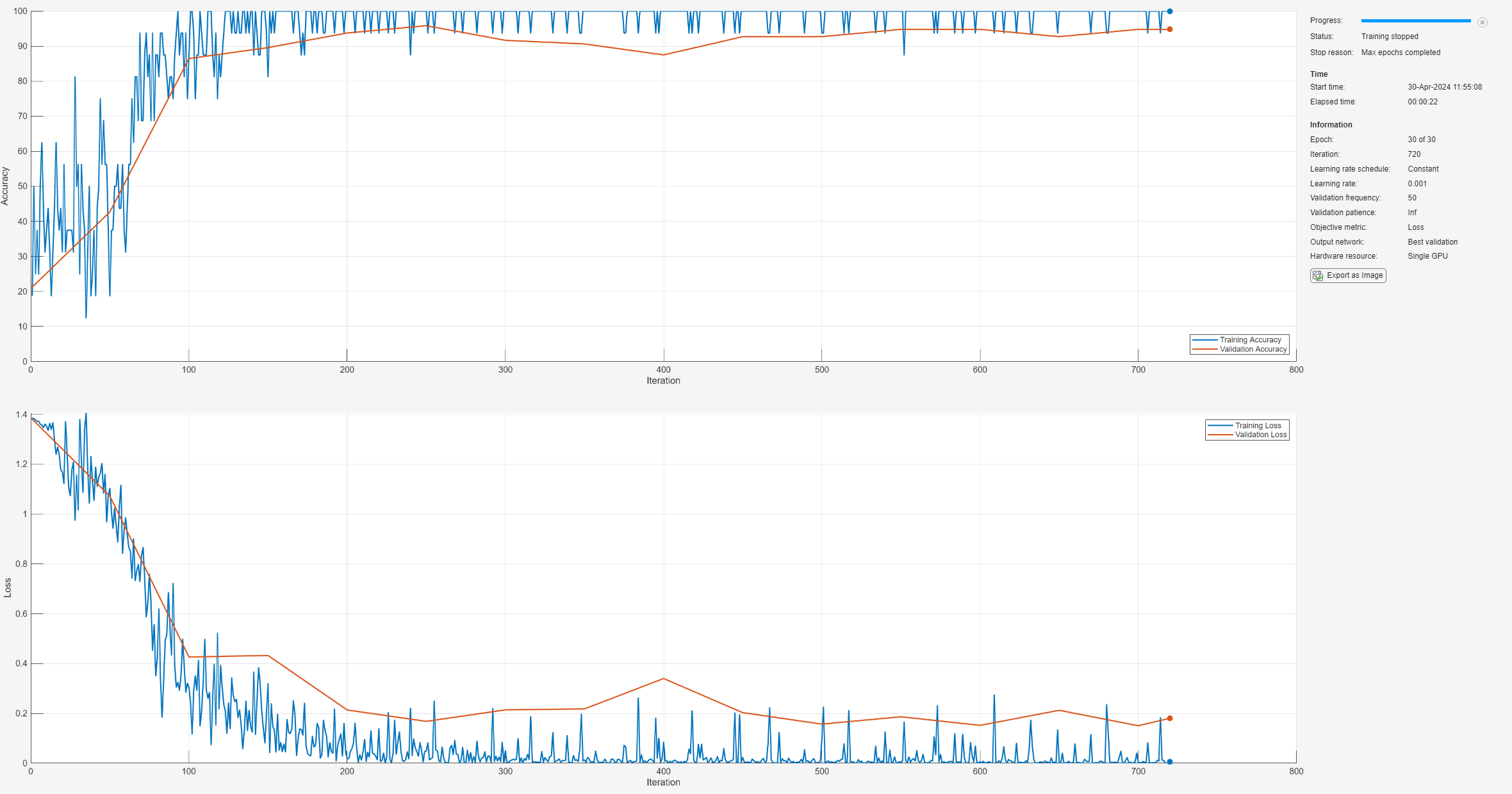 options = trainingOptions("adam", ... InputDataFormats="CTB", ... MiniBatchSize=16, ... GradientThreshold=2, ... Shuffle="every-epoch", ... ValidationData={XValidation,YValidation}, ... Plots="training-progress", ... Metrics="accuracy", ... Verbose=false);