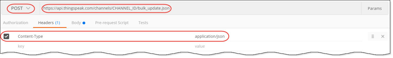 You can configure POSTMAN to try RESTful API calls. To send an HTTP POST request to bulk-update a channel feed using a JSON object, configure the POSTMAN as shown: