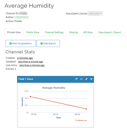thingSpeakWrite(writeChannelID,avgHumidity,'writekey',writeAPIKey);4) Execute your code by clicking Save and Run. The chart in your ThingSpeak channel is populated with a single point representing average humidity. You can access your channel by clicking the channel link in the Channel Info panel on the right side of the page.