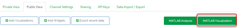MATLAB visualizations provide more control of the analysis and plots compared to the default ThingSpeak plots shown in your channel view. Certain license types also allow automatic updates of the visualizations. You can use both time and threshold filtering to improve the data visualization. For this example, visualize the relationship between temperature and soil moisture. Start by clicking the MATLAB Visualization button on your channel view.
