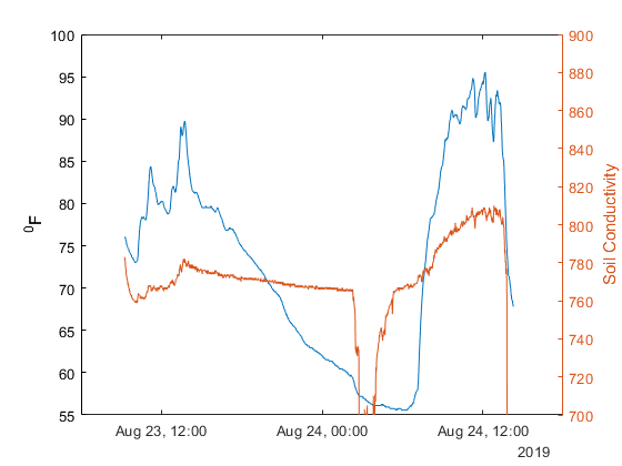 yyaxis right plot(sensorData.Timestamps,sensorData.SoilMoisture); ylabel('Soil Conductivity'); ylim([700 900]); hold off;