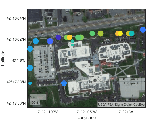 geoscatter(mapData.Latitude,mapData.Longitude,mapData.SoilMoisture,mapData.TemperatureF,'filled');